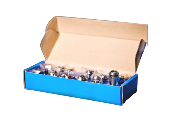 Набор цанг ER20 со сквозным отверстием и двумя зонами зажима. В набор входят цанги для зажима инструмента с цилиндрическим хвостовиком диаметром 2.5, 3.5, 4.5, 5.5, 6.5, 7.5, 8.5, 9.5, 10.5, 11.5 и 12.5 мм в индивидуальной упаковке. Цанги специально изготовлены для использования на заточных станка GSC. Их принципиальное отличие от стандартных цанг ER20 по DIN 6499 (ISO 15488) заключается в том, что поверхность зажима расположена в длинной части цанги. Это связано с тем, что затачиваемый инструмент имеет обратное расположение относительно цанги.