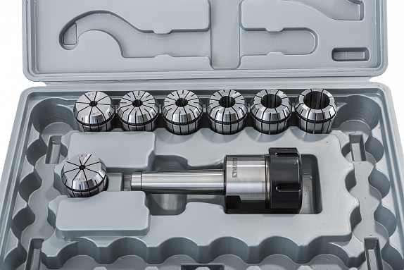 Цанговый патрон МК-3 представляет собой элемент основной оснастки, рассчитанной на работу с цангами марки ER40. Приспособление идет на укомплектование фрезерно-сверлильного оборудования, выпускаемого компанией JET. В комплекте с патроном идет набор цанг марки ER40, рассчитанных на работу в сложных режимах обработки. Цанги имеют различные диаметры 6,8,10,12,20 и 25 мм, с помощью которых возможна установка на станок режущих инструментов и сверл средних и больших диаметров. Патрон имеет посадку в шпиндель станка под конус Морзе 3 и прижимной механизм для фиксации цанг. В наборе предусмотрено наличие зажимный ключ.