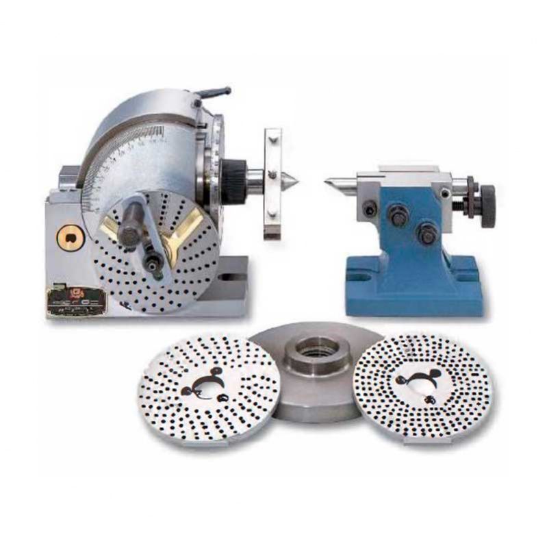 Полууниверсальная делительная головка -это упрощенный тип универсальной делительной головки, может использоваться для непосредственной и опосредованной угловой индексации. Никаких вспомогательных приспособлений для работы с дифференциальной угловой индексацией не включено, но вся конструкция делительной головки и задней бабки идентична конструкции универсального типа. Блок имеет диск непосредавенного деления с 24 отверстиями, позволяющими непосредственное деление на 2,3,4,6,8, 12 и 24 делений. Три других делительных диска предлагаются как стандартные для облегчения опосредованной угловой индексации всех делений от 2 до 50, а также наиболее применяемых делений до 380.