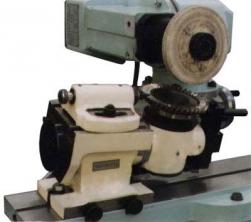 Принцип работы: Затачиваемый косозубый долбяк устанавливают непосредственно или на оправке в шпиндель приспособления. Шпиндель разворачивается на угол, соответствующий углу наклона зубьев. С помощью упора и фиксатора с насадками (соответствующими модулю долбяка) ориентируют долбяк. Ось шлифовального круга располагают горизонтально и перпендикулярно направлению продольного перемещения стола. Затачивают текущий зуб. Убирают фиксатор, делят на зуб, вводят фиксатор во впадину и затачивают следующий зуб.