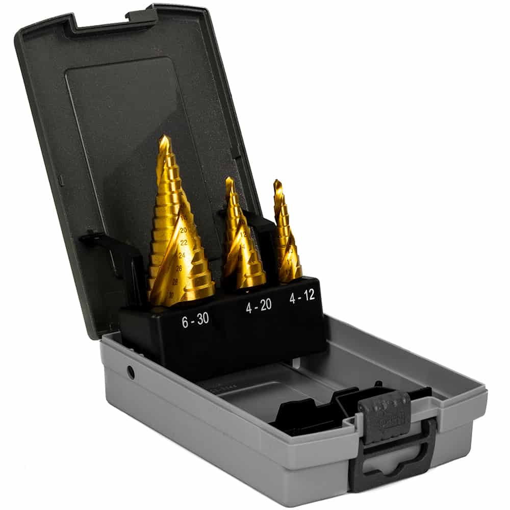 Набор ступенчатых сверл для сверления отверстий в листах металла.