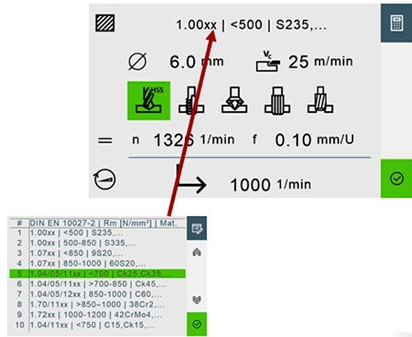 Вход: Диаметр инструмента. Вход: Скорость резки материала в м/мин. Выбор: Обработка сверла, метчика и т. д. или альтернатива Исходные данные: диаметр инструмента. Выберите: выбор материала из списка. Выберите: сверло, резьба и т.д.